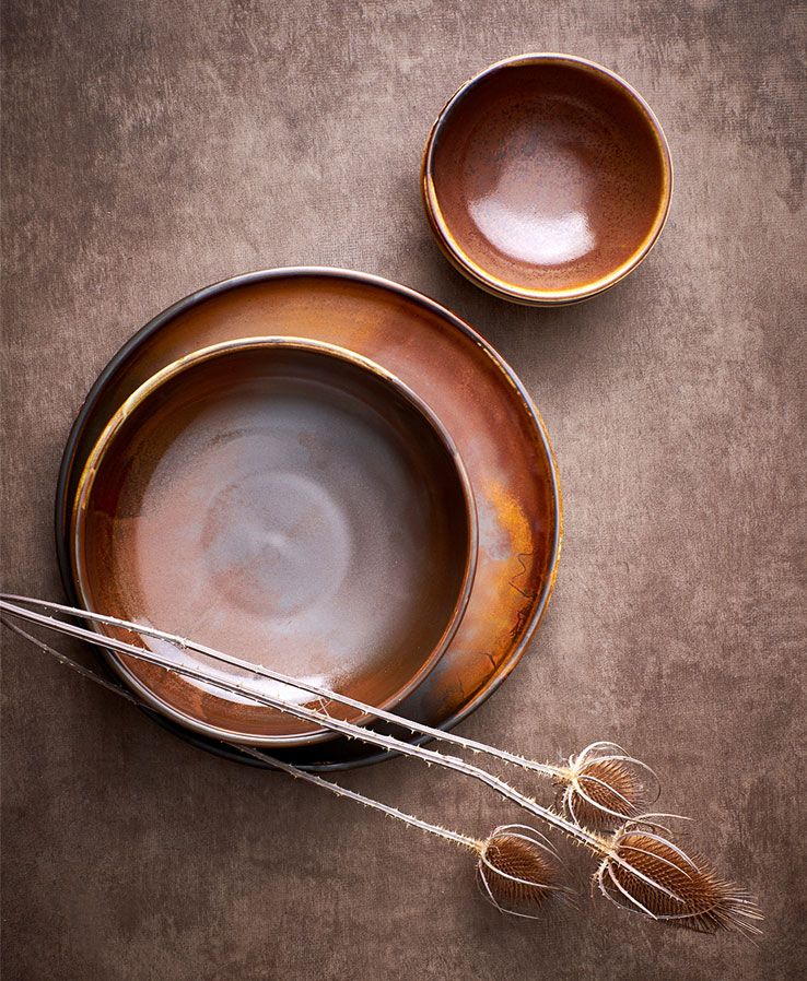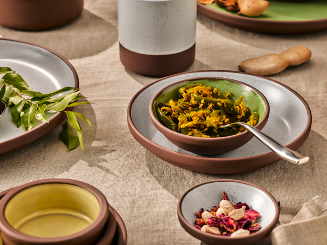 La elección fue la colección Spice de Maham Studio, una línea de terracota vitrificada diseñada para uso profesional, pero con una fuerte inspiración en la artesanía mexicana.