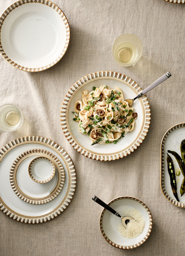 En La Piazzetta, el objetivo era trasladar al comensal a una experiencia auténtica, evocadora y cercana. Para ello, se seleccionó la colección Adelaide de Robert Gordon, una referencia internacional en diseño de vajilla contemporánea con inspiración artesanal.